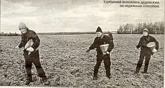 Мы тщательно очерчивали круг с помощью кола, веревки и соответствующей матери. Потом вручную вносили удобрения (все по инструкции!). Володя М., автор предыдущей публикации о проблеме кругов, мужественно переносил это испытание, доказывая, что силен не только в теории. Потом завелись трактора и пошли по полю.